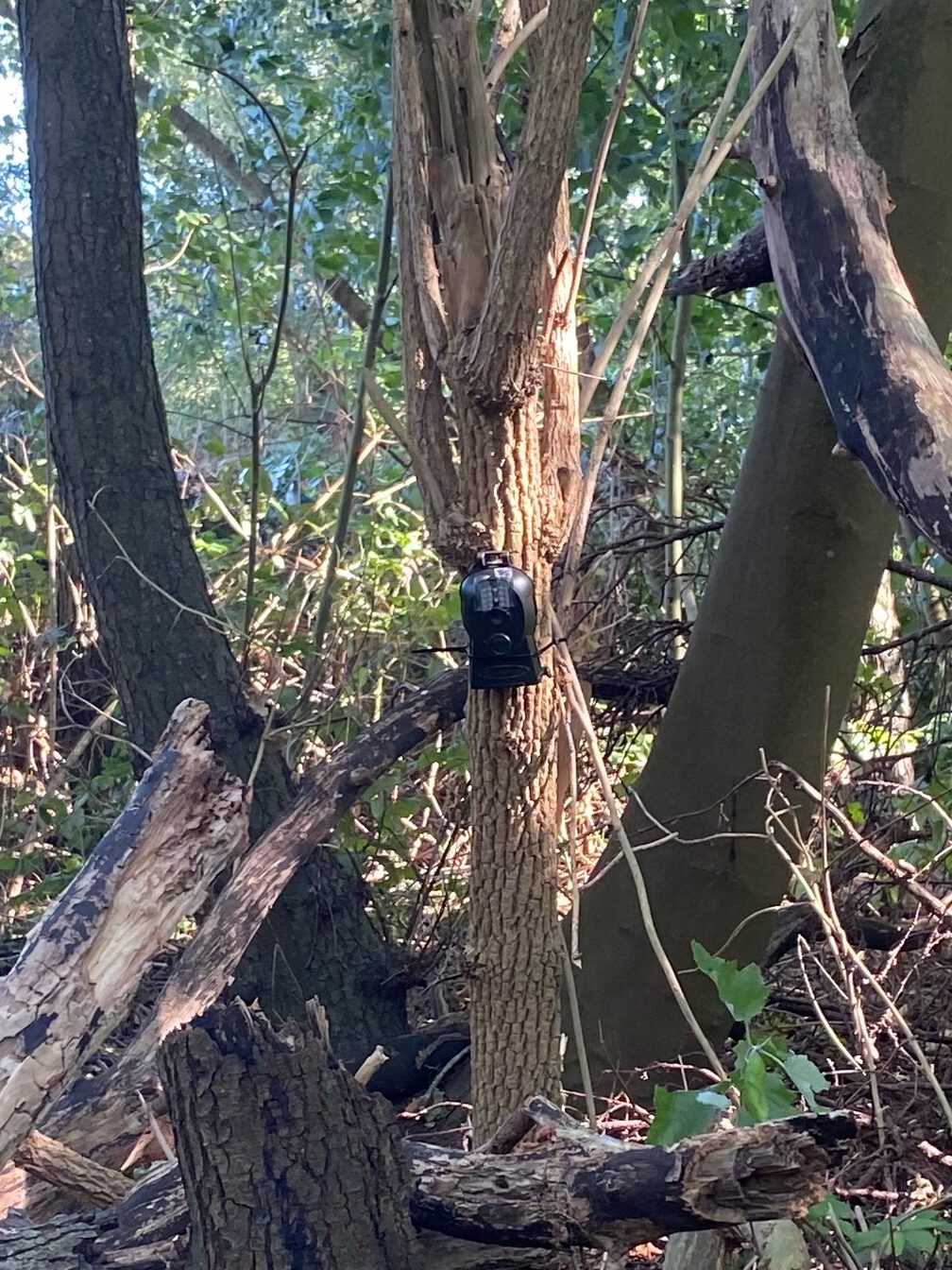 De andere camera’s zijn gewone wildcamera’s die met een band aan een boom worden bevestigd.